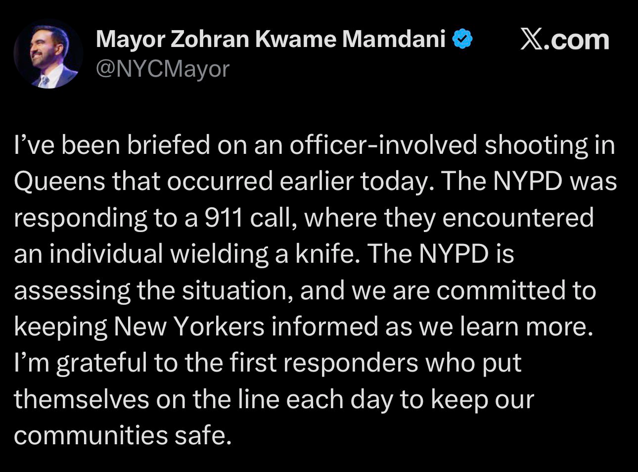 How did NYC mayor Zohran Mamdani speak about this tragedy? He stated in response to the “officer-involved shooting” that he was “grateful to the first responders who put [their lives] on the line...”